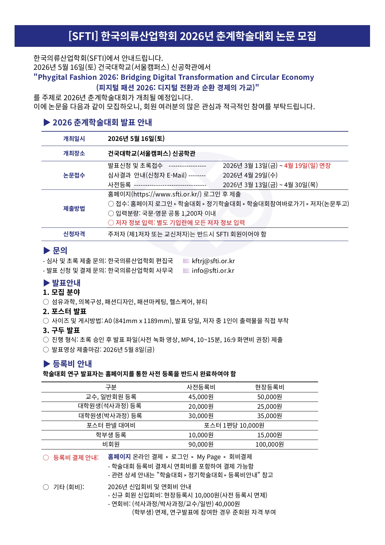 | 논 문 접 수 | 발표신청 및 초록접수 | 2026년 3월 13일(금) ~ 4월 19일(일) |
