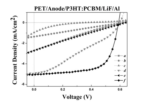 Fig. 1. J-V curves under AM 1.5G(100mW/cm2) of organic solar cells with various